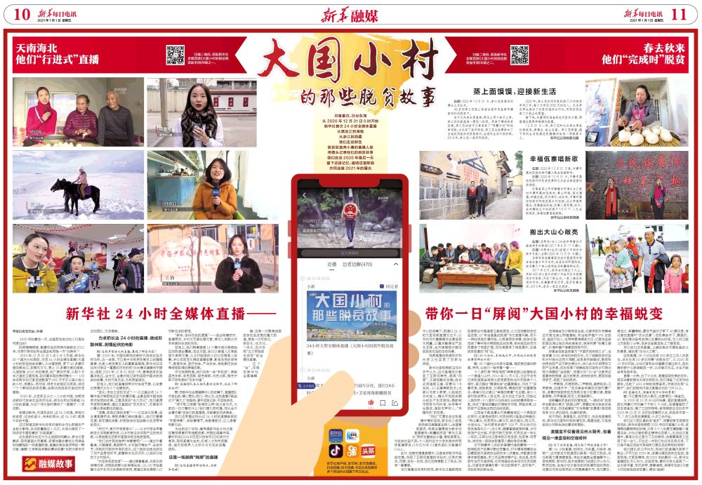 2020年12月31日0點0分0秒起,新華社26個國內(nèi)分社聯(lián)動,開啟24小時全媒體直播《大國小村的那些脫貧故事》。從白雪皚皚、零下40多攝氏度的黑龍江,到椰風(fēng)習(xí)習(xí)、零上10多攝氏度的海南,從海拔超4000米的高原,到廣袤的平原,從數(shù)十萬米之遙的衛(wèi)星視角,到纖毫畢現(xiàn)的特寫鏡頭……100余名新華社記者走進散落于960萬平方公里土地上的小村,用鏡頭、用對話、用老鄉(xiāng)的皺紋與笑容,講述一個個鮮活的脫貧故事,繪就決戰(zhàn)脫貧攻堅的恢宏畫卷。