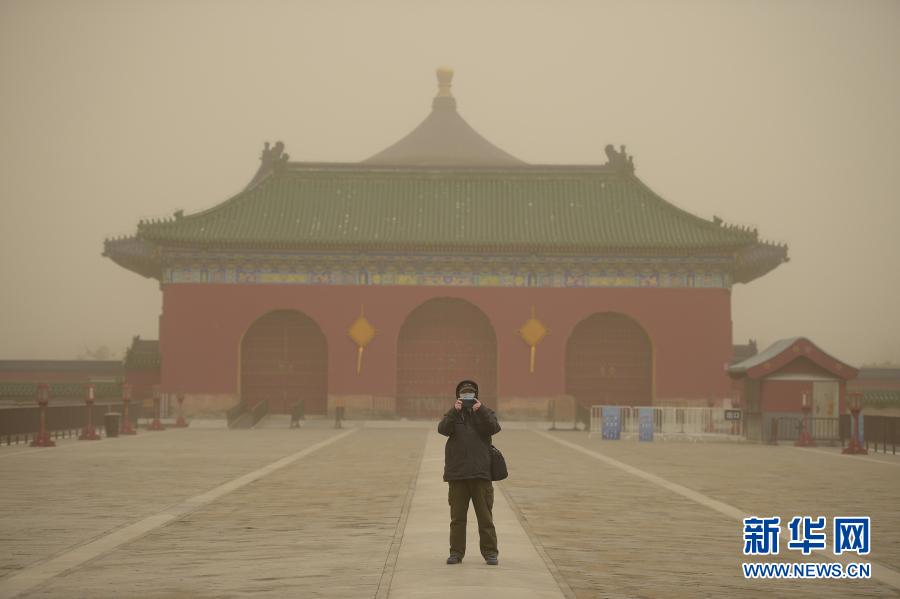 3月15日,市民在北京天壇公園里拍照。當日,我國北方多地出現沙塵天氣。新華社記者 彭子洋 攝
