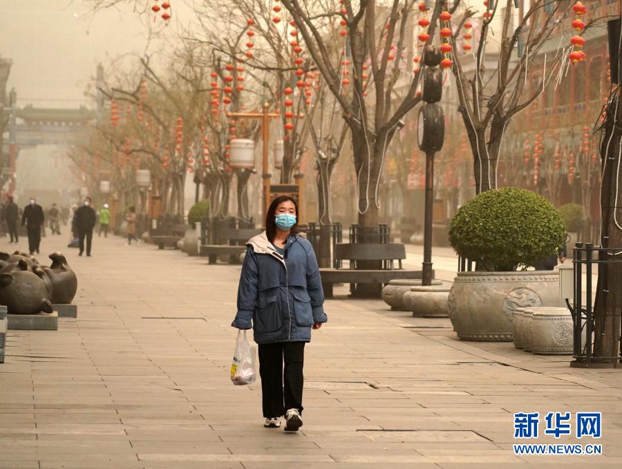 3月15日,行人走在北京前門商業(yè)街。當(dāng)日,我國北方多地出現(xiàn)沙塵天氣。新華社記者 張晨霖 攝