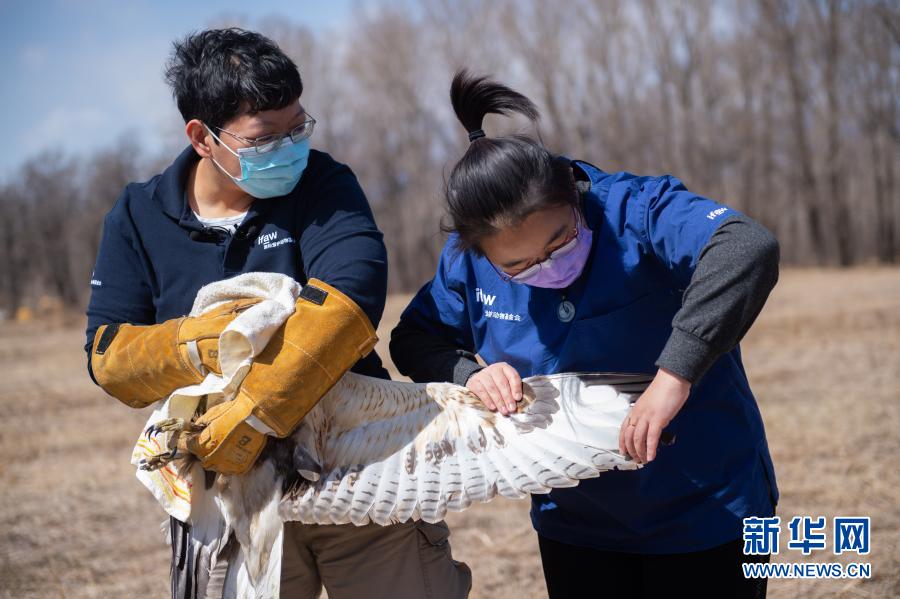 3月20日,北京猛禽救助中心猛禽康復師戴暢(右)和周蕾在放飛大鵟前對其進行最后的檢查。新華社記者 陳鐘昊 攝