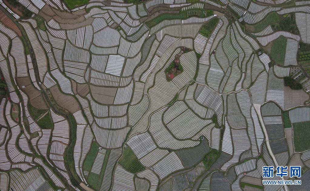 4月5日在貴州省遵義市余慶縣白泥鎮團結村烏楊大壩現代農業蔬菜種植示范區拍攝的田園風光(無人機照片)。