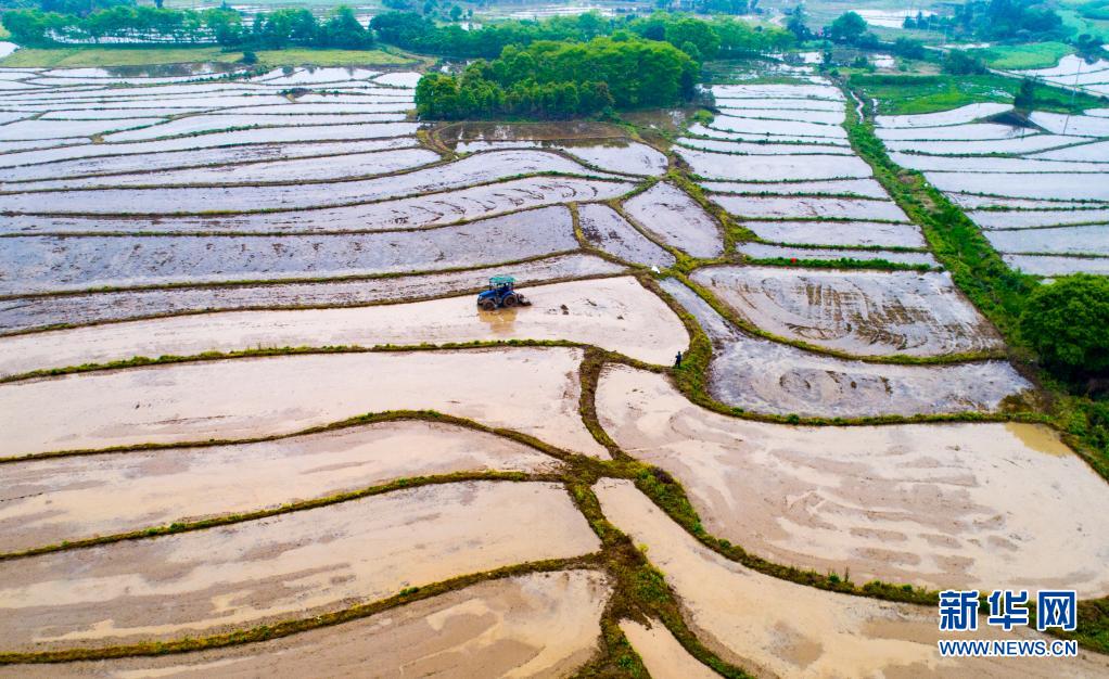 4月6日,江西省新余市仙女湖區鈐陽辦事處白田村農民駕駛農機耙田、施肥,為早稻插秧作準備(無人機拍攝)。
