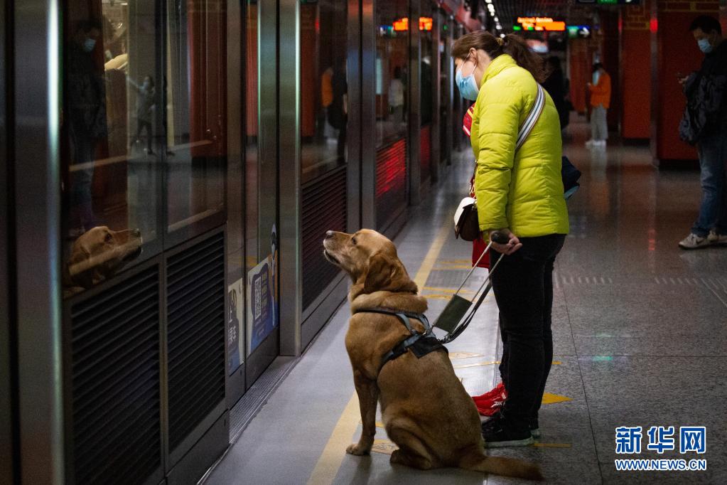 導(dǎo)盲犬“多多”陪伴祝愛(ài)葉在地鐵站內(nèi)準(zhǔn)備乘坐地鐵(3月13日攝)。 新華社發(fā) (張夢(mèng) 攝)