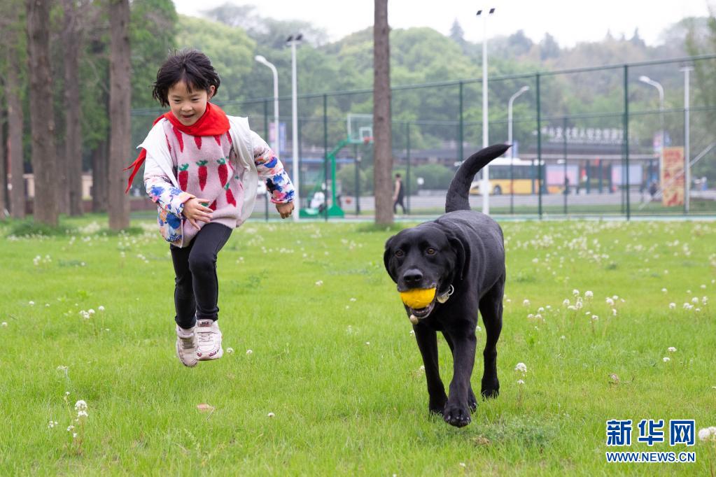 導盲犬“C羅”和吳虎剛的女兒在草地上玩耍(4月26日攝)。 新華社發 (張夢 攝)