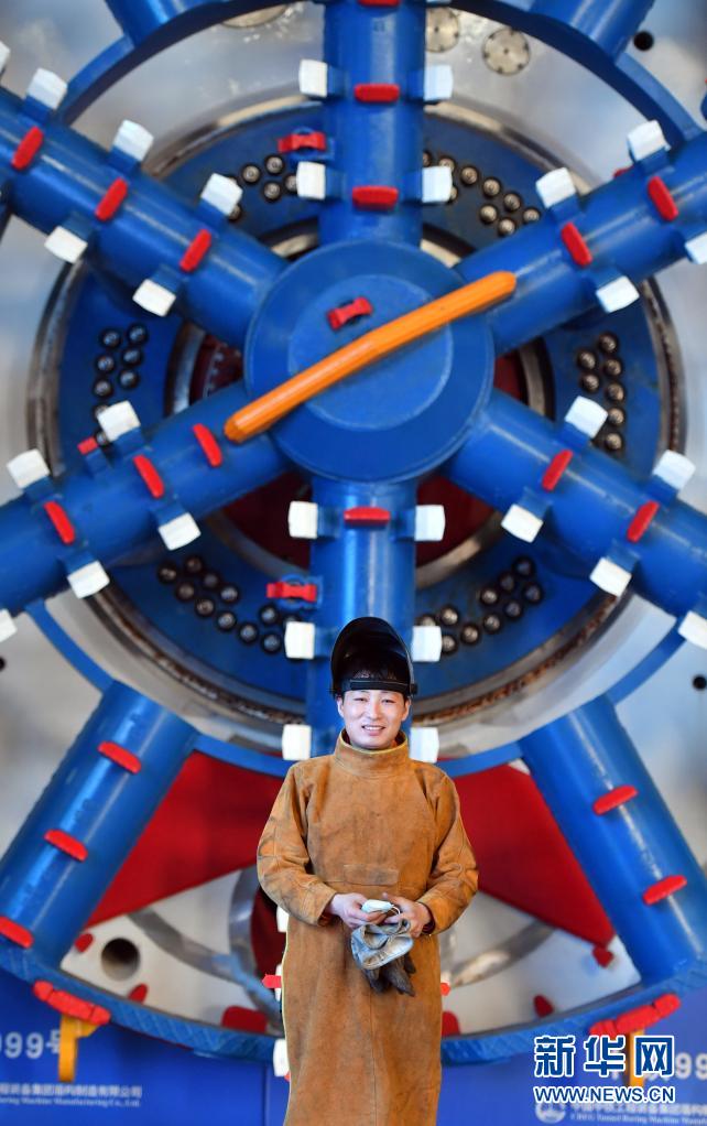 王安永在中鐵工程裝備集團車間與盾構機合影(4月23日攝)。