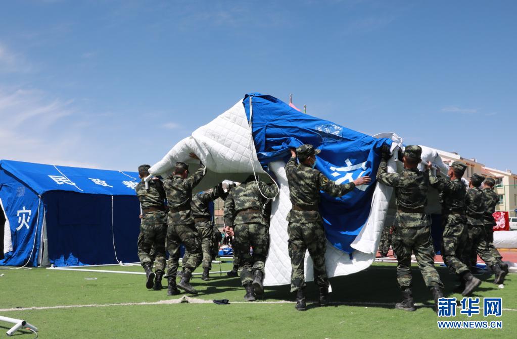 5月24日,武警青海總隊果洛支隊機動大隊官兵為花石峽鎮(zhèn)藏文中心寄宿制小學搭建帳篷教室。新華社記者 劉新 攝