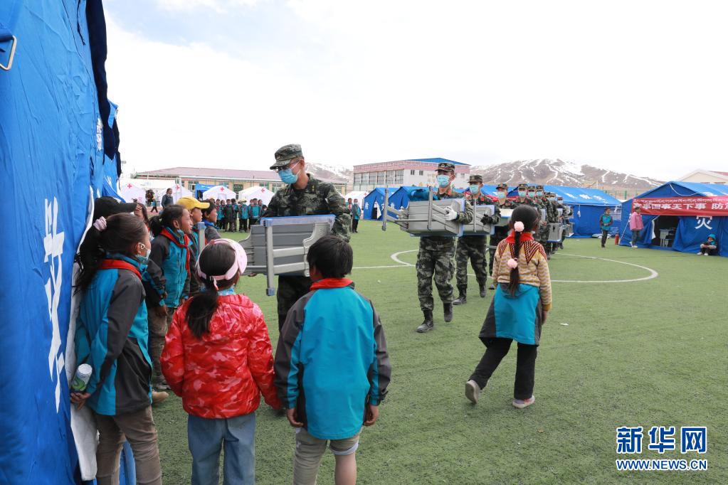 5月24日,武警青海總隊果洛支隊機動大隊排長張國睿(前一)和戰友為花石峽鎮藏文中心寄宿制小學的帳篷教室搬運課桌。新華社記者 劉芳 攝