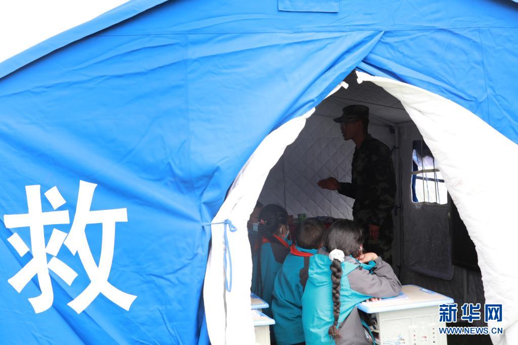 5月24日,武警青??傟牴逯ш牂C動大隊排長張國睿為花石峽鎮藏文中心寄宿制小學的孩子上課。新華社記者 劉芳 攝