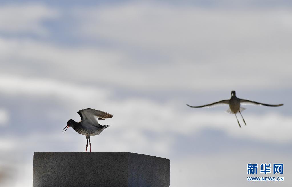 初夏,紅腳鷸在位于西藏拉薩的拉魯濕地國(guó)家級(jí)自然保護(hù)區(qū)內(nèi)起舞覓食。