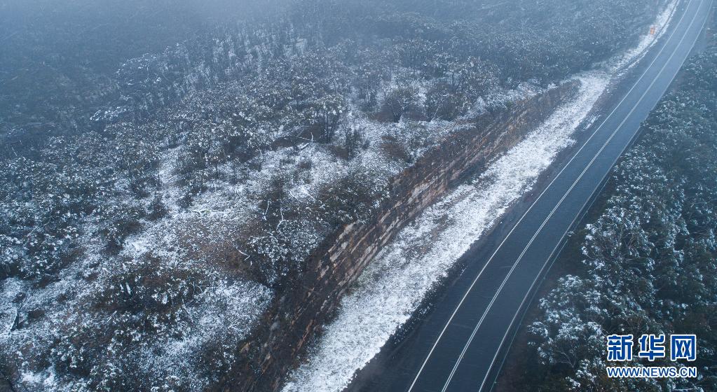 這是6月10日在澳大利亞新南威爾士州藍(lán)山地區(qū)拍攝的一條雪后公路(無(wú)人機(jī)照片)。