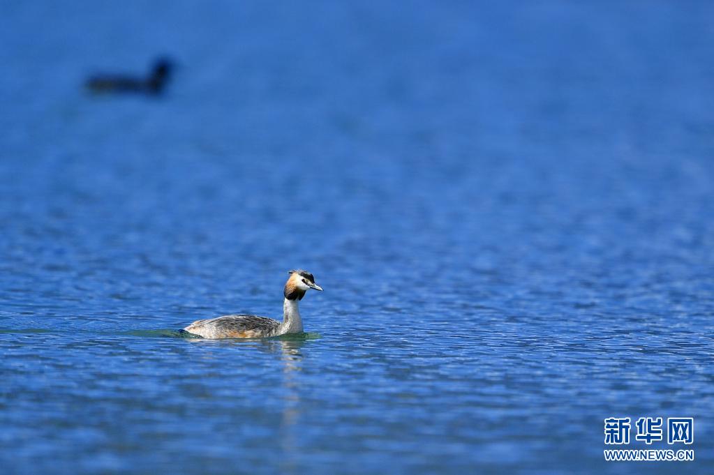 6月14日在拉魯濕地拍攝的鳳頭??。夏日里,鳳頭??和小??在西藏拉薩拉魯濕地國家級自然保護區水面上嬉戲。新華社記者 張汝鋒 攝