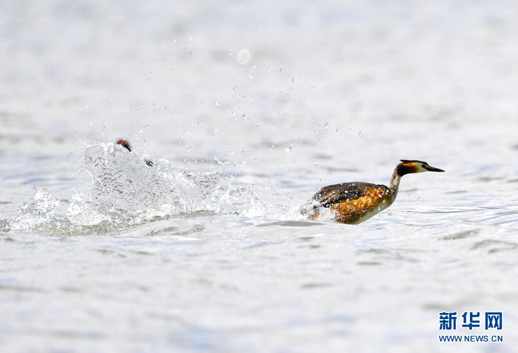 6月14日在拉魯濕地拍攝的鳳頭??。夏日里,鳳頭??和小??在西藏拉薩拉魯濕地國家級自然保護區水面上嬉戲。新華社記者 張汝鋒 攝