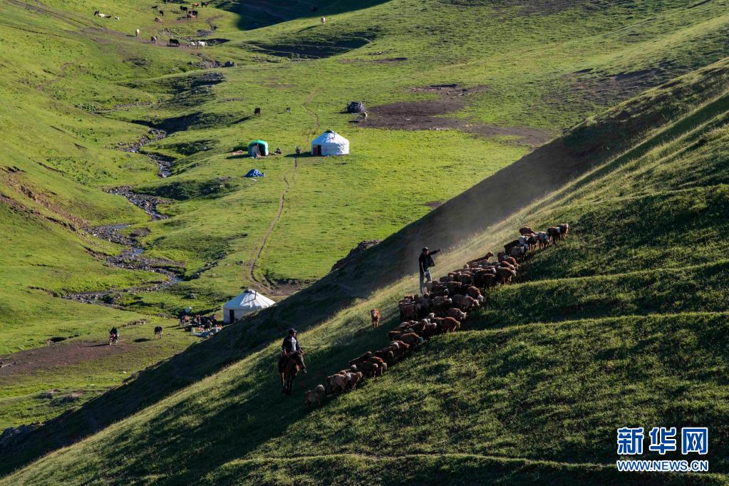 眼下,巴爾魯克山區(qū)的夏牧場(chǎng)迎來(lái)放牧黃金季。群山起伏,峰巒翠綠,氈房、牛羊等牲畜分散點(diǎn)綴其間,自駕游客時(shí)而穿梭往來(lái),共同譜寫(xiě)一曲高山夏季牧歌。