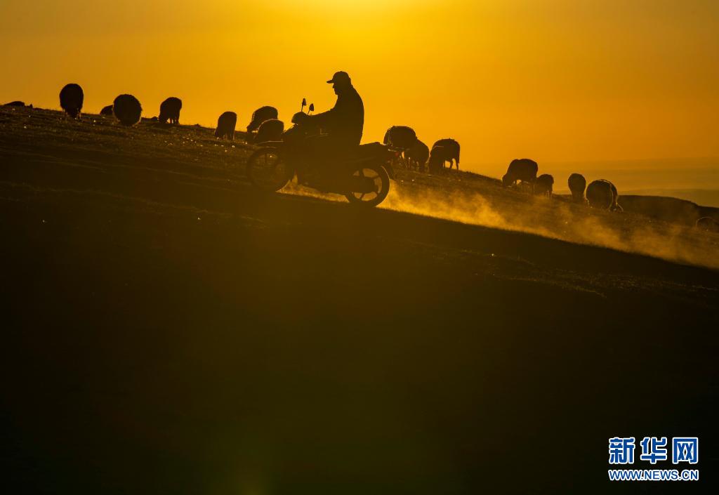牧歸時分,在新疆裕民縣巴爾魯克山區夏牧場上,一名牧民騎著摩托車“收攏”羊群(6月15日攝)。