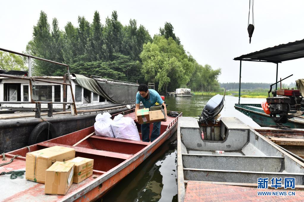 6月20日,在微山縣南陽鎮,郵遞員王少朋往郵船上裝郵件,準備為村民投遞。
