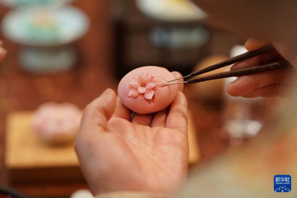 1月9日,一名爱好者在李欢的唐果子制作体验项目中跟着制果师学习制作唐果子。