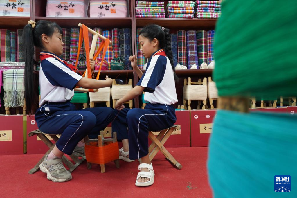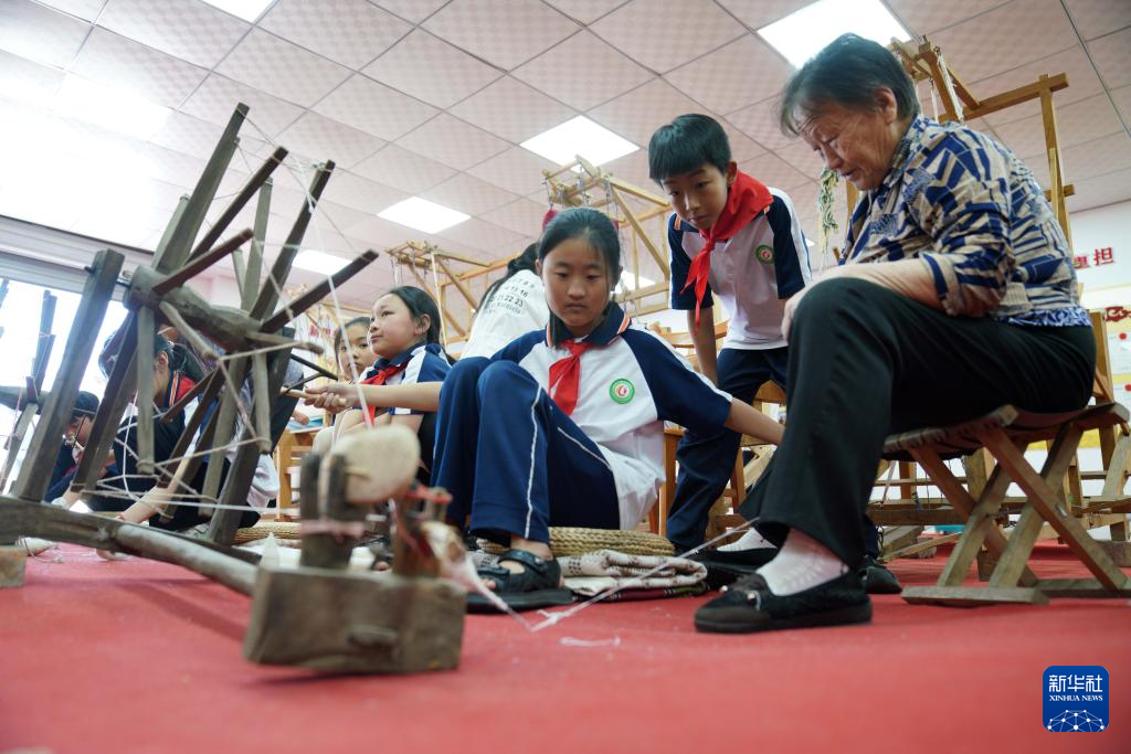 5月24日,小学生在河北省沙河市塔子峪村非遗传习所内体验四匹缯布制作技艺。