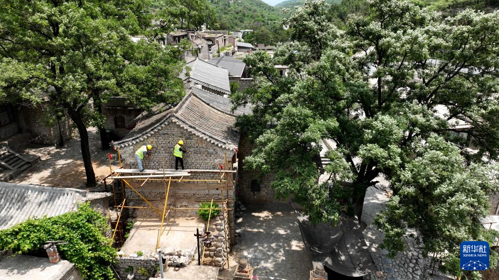 6月7日,在河北省石家庄市井陉县小梁江村,施工人员对村中古建筑进行修缮(无人机照片)。