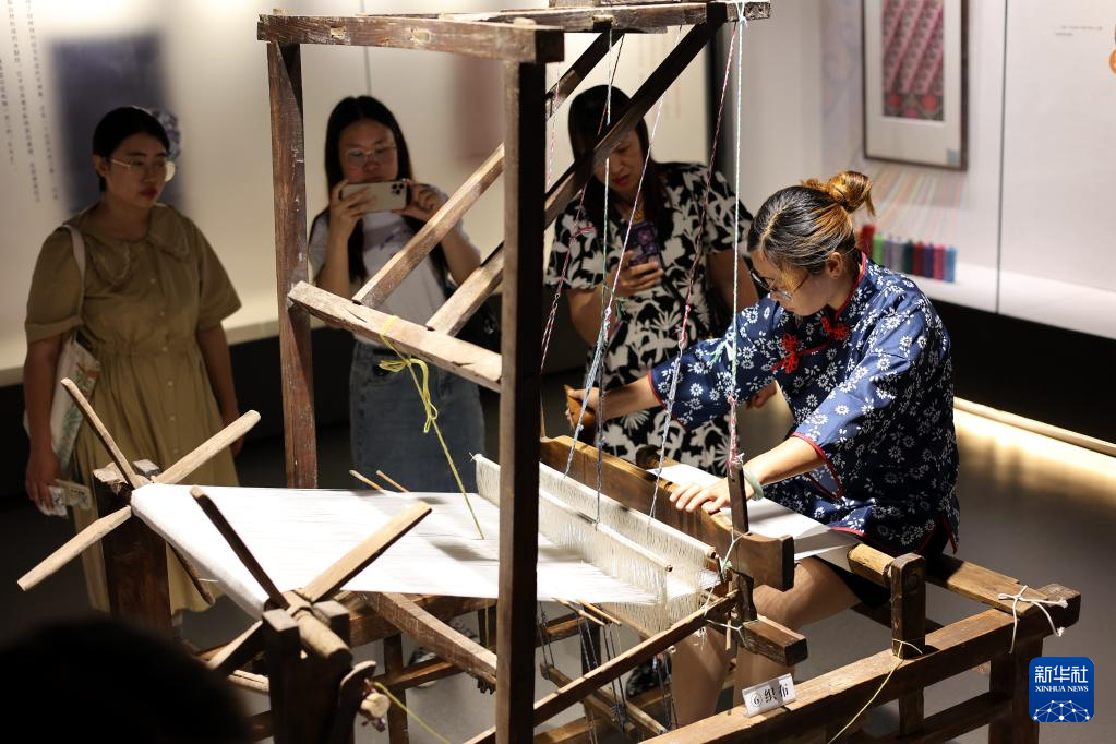 6月10日,在山东省滨州市博物馆,非遗传承人向参观者展示传统织布技艺。