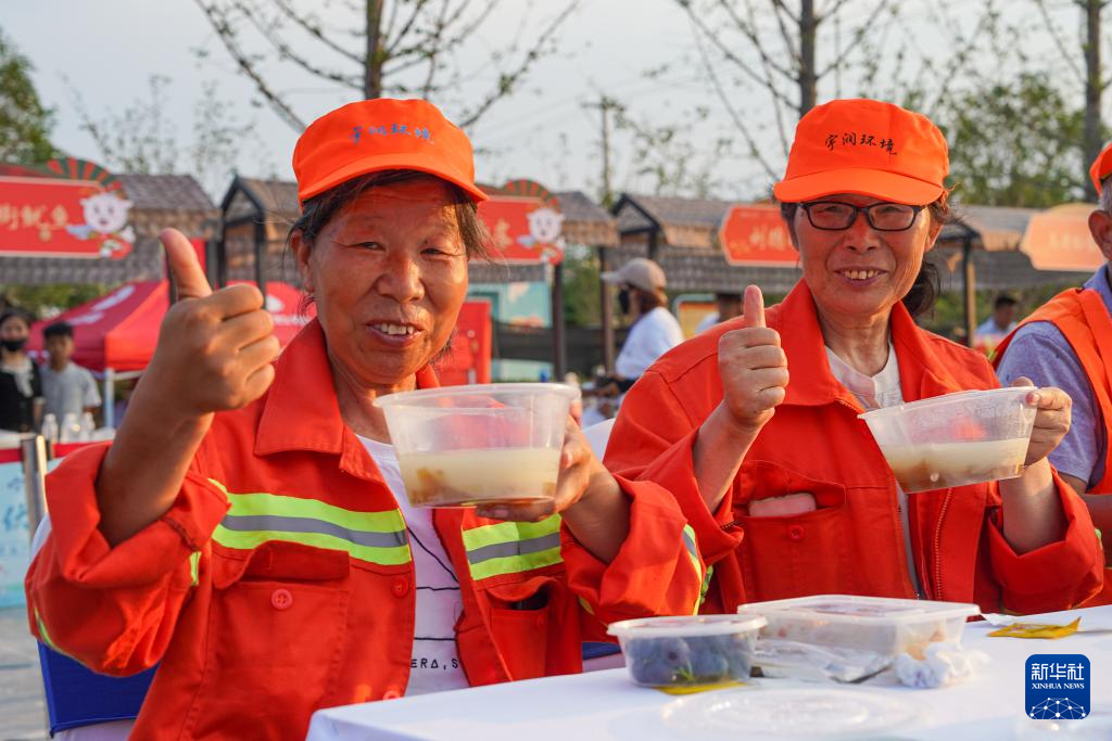 7月11日,在安徽省宿州市萧县水墨圣泉古镇广场,环卫工人品尝羊汤。