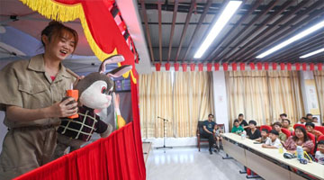 7月22日,参展人员用瓷碗演奏音乐。
