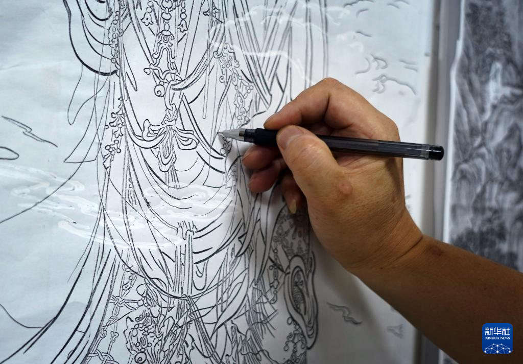 黄俊军在工作室里绘制铜雕草图(7月13日摄)。