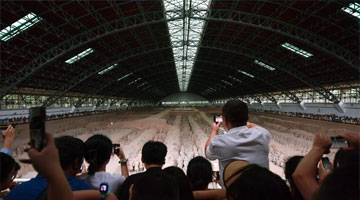 一位客人在欣赏倪朋辉创作的砖雕作品《盛唐六骏》之一“飒露紫”(8月25日摄)。