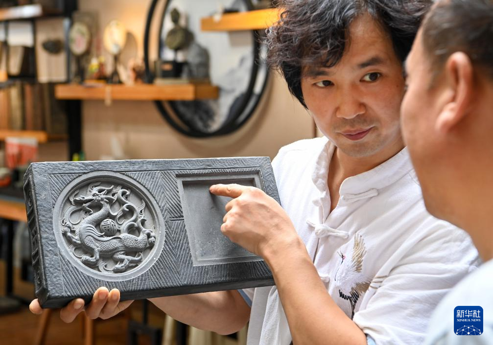 倪朋辉(左)向来宾展示“东方苍龙”砖雕作品(8月25日摄)。