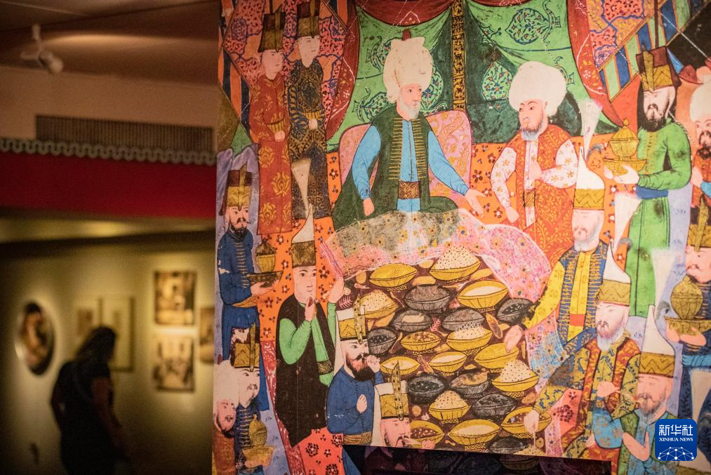 这是8月24日在耶路撒冷举行的古代阿拉伯世界饮食文化展上拍摄的描绘婚宴场景的绘画。