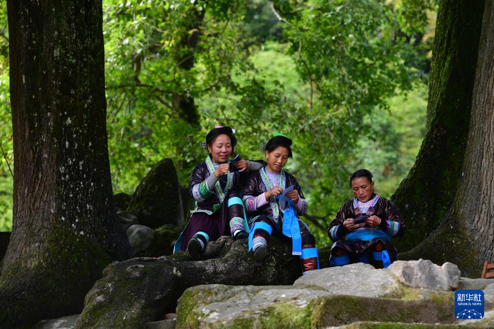 乌英苗寨妇女梁足英(左一)在刺绣(2019年10月18日摄)。
