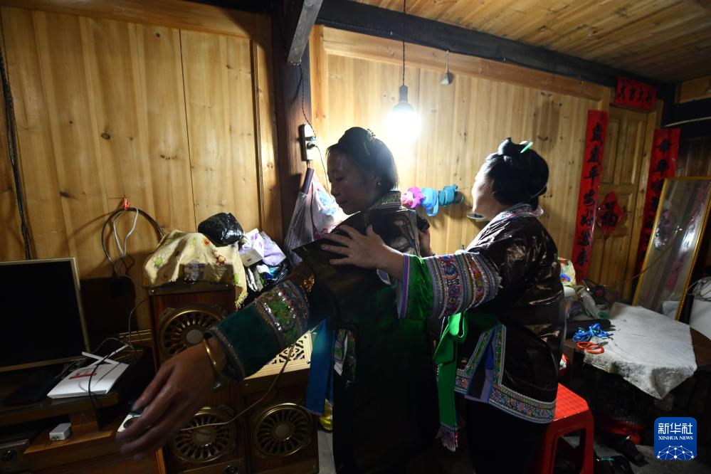 乌英苗寨妇女梁足英(左)、吴妹秋准备缝制亮布衣服,这是吴妹秋在给梁足英量身(2023年8月31日摄)。