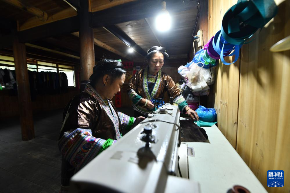 乌英苗寨妇女梁足英(右)、吴妹秋在缝制亮布衣服(2023年8月31日摄)。