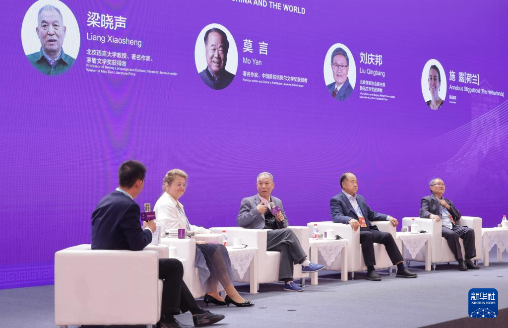 9月15日,作家莫言(右二)在“以文化人:文艺价值与社会生活”平行论坛的“中国文学与世界对话”圆桌对话现场发言。