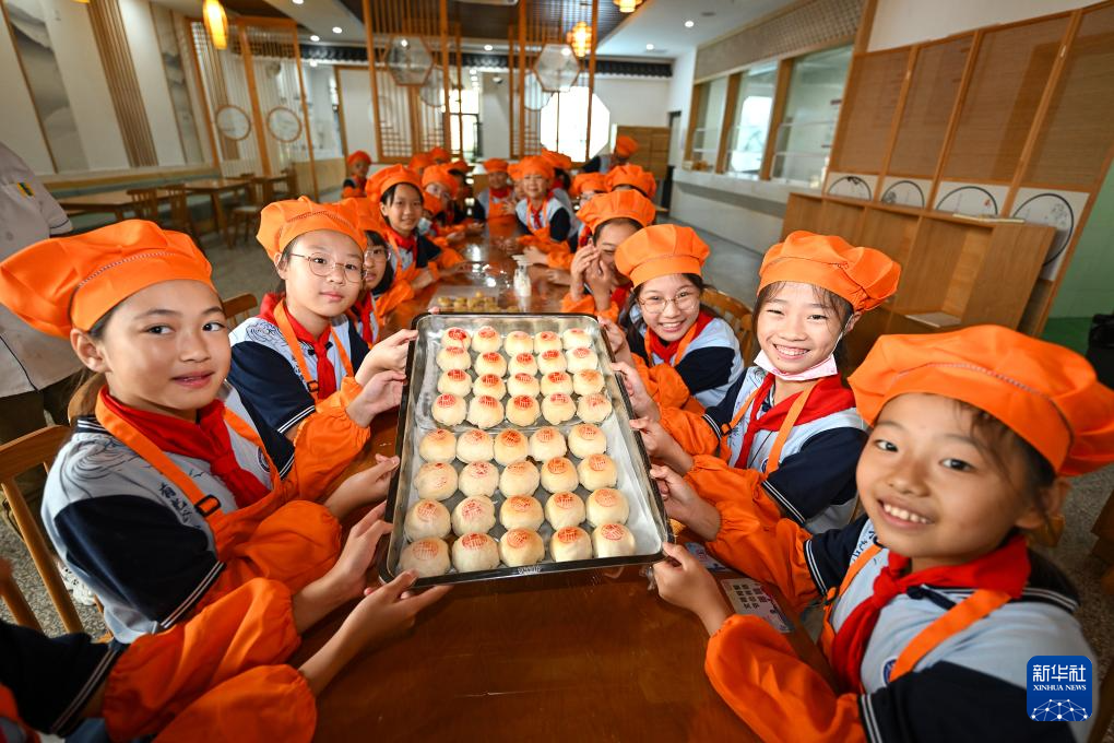 9月27日,在江苏省昆山开发区震川小学,学生们展示烘焙好的月饼。