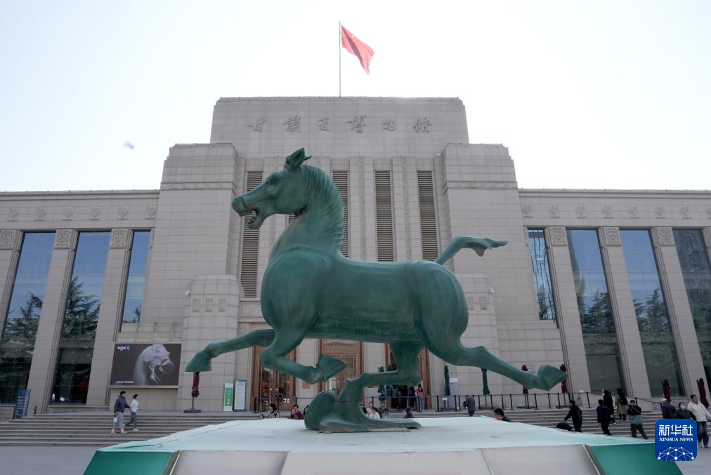 甘肃省博物馆前矗立的铜奔马雕塑(2023年10月27日摄)。