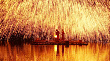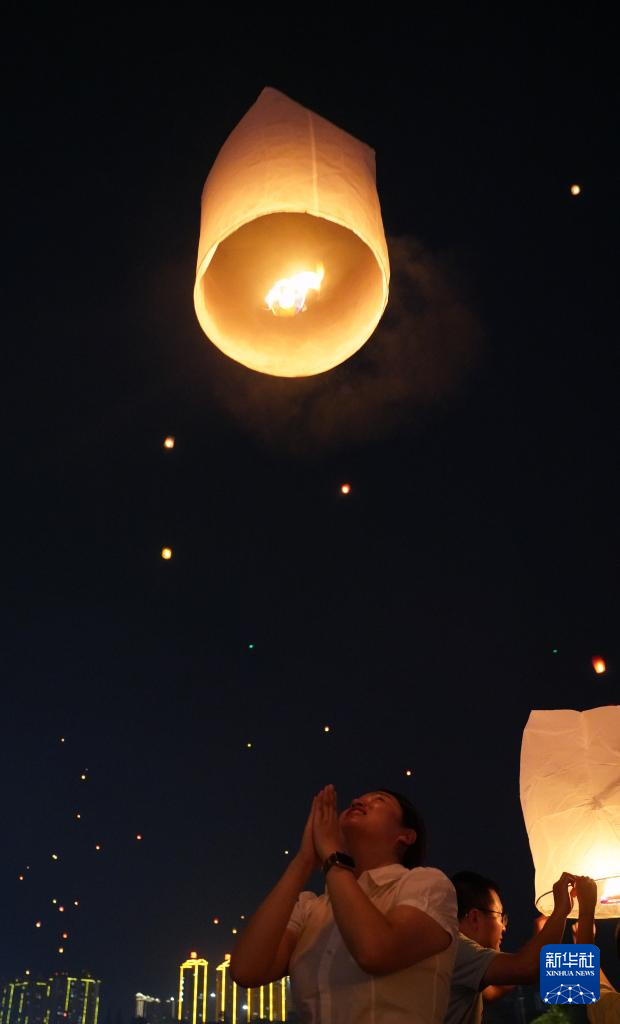 4月13日晚,人们在云南省景洪市澜沧江边放飞孔明灯。