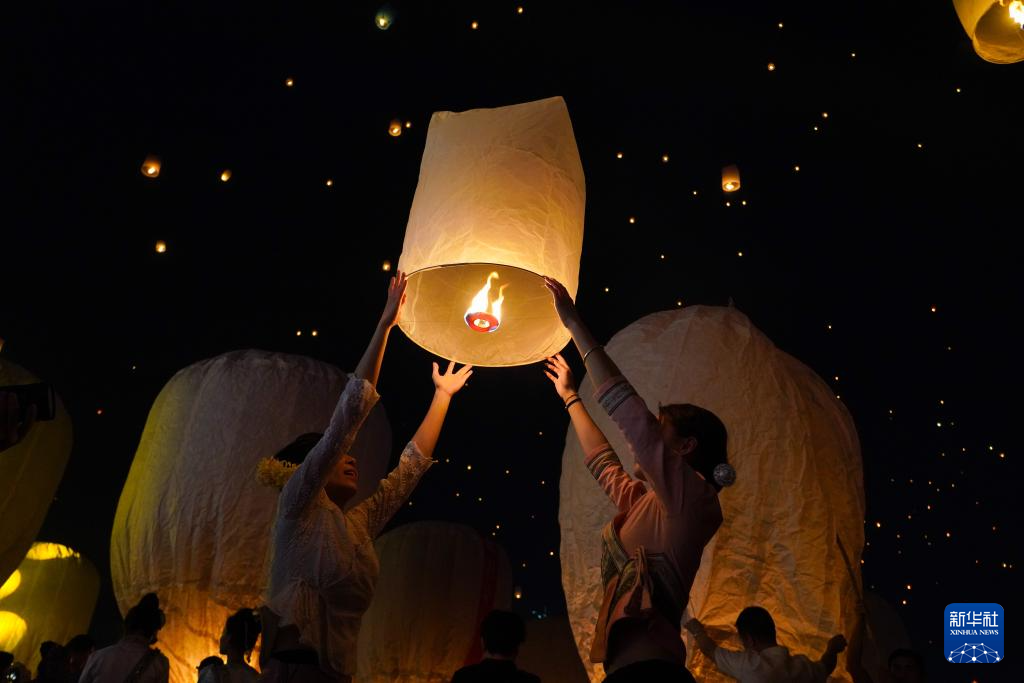 4月13日晚,在云南省西双版纳傣族自治州景洪市,人们在澜沧江边放飞孔明灯,庆祝泼水节。