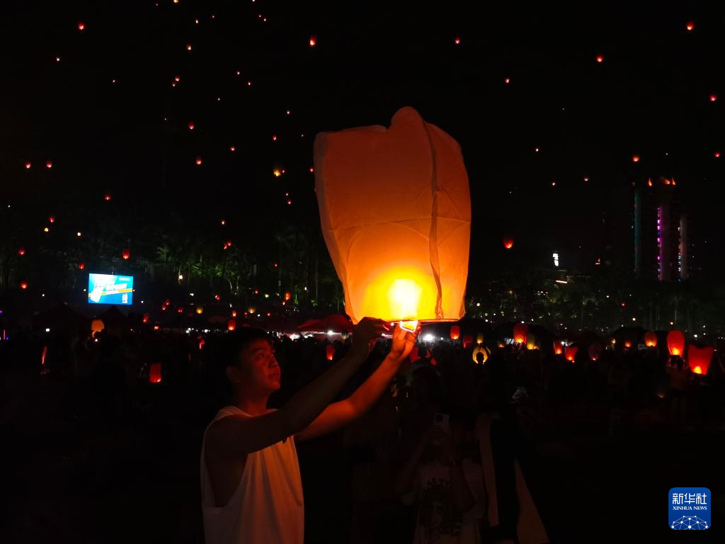 这是4月13日晚在云南省景洪市澜沧江边拍摄的孔明灯。