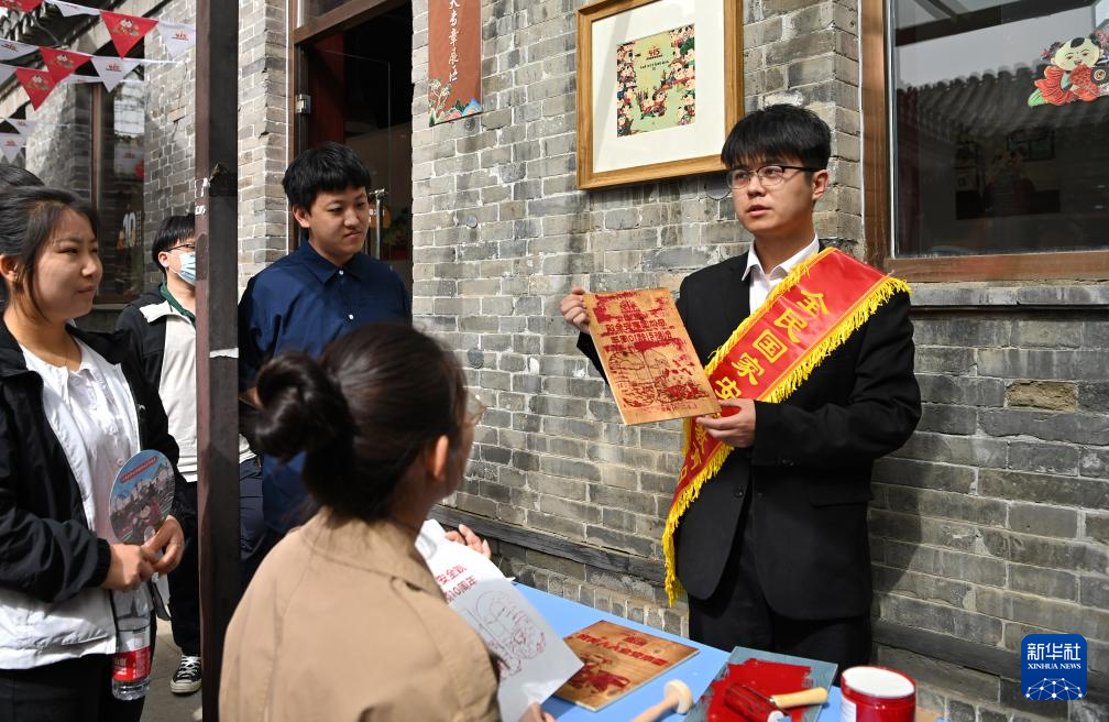 4月15日,小学生在国家安全年画娃娃艺术展上自己动手印刷了一张年画。