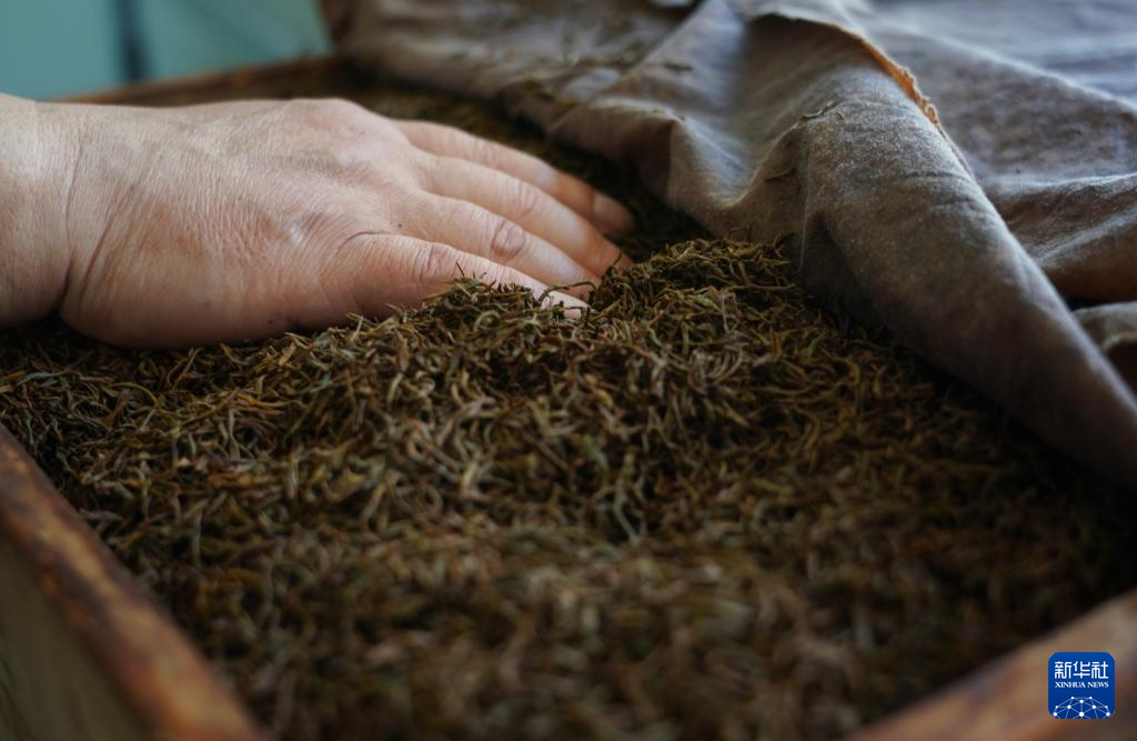 江西省修水县漫江乡的宁红茶制茶基地,俞旦华用手感受茶叶发酵的温度(3月29日摄)。