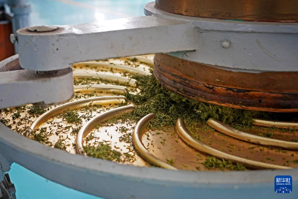 江西省修水县漫江乡的宁红茶制茶基地,揉捻设备对茶叶进行机械化揉捻(3月29日摄)。