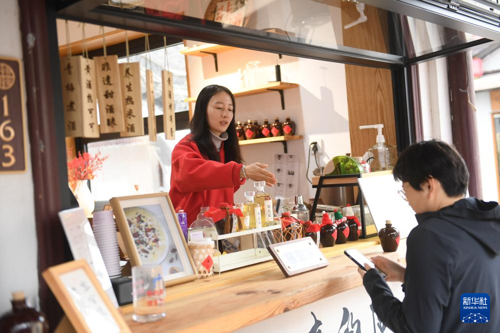 2月20日,仓桥直街一家店铺的店员在指导游客购买黄酒咖啡。