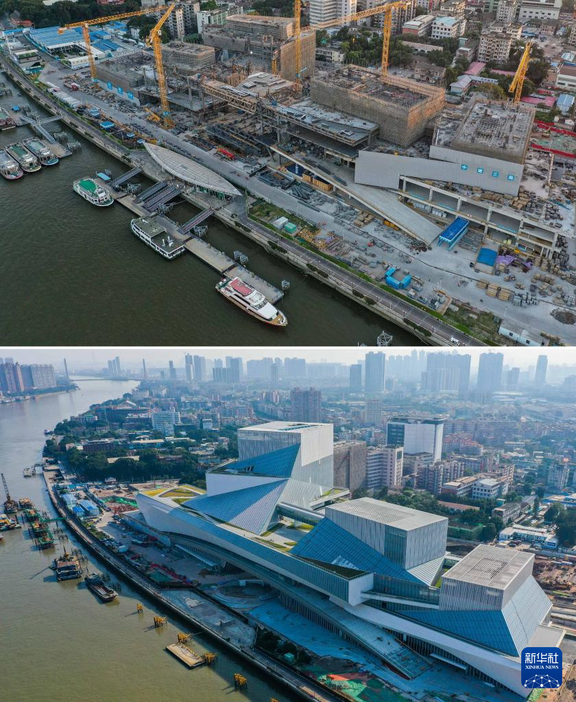 拼版照片:上图为基坑施工阶段的白鹅潭大湾区艺术中心(新华社发,2021年3月26日摄);下图为即将竣工的白鹅潭大湾区艺术中心(新华社记者刘大伟2023年12月27日摄)。