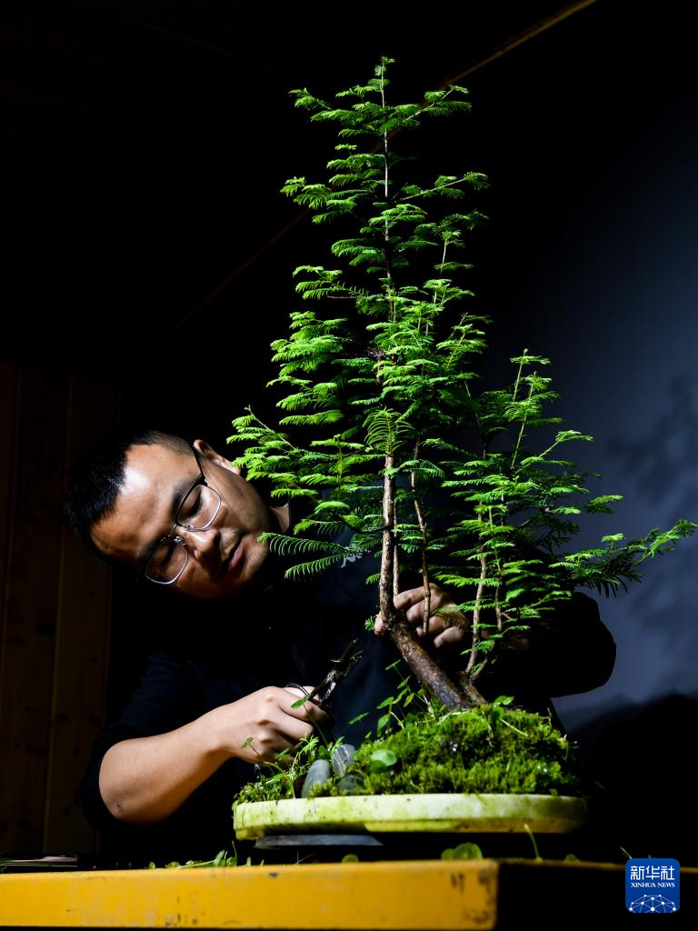 5月2日,在四川省成都市温江区,陈宏宇在工作室对盆景进行修枝。