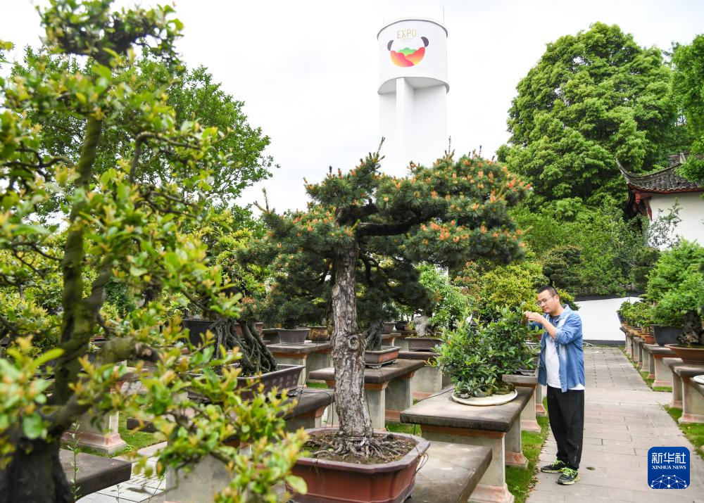 4月23日,在成都世园会温江分会场,陈宏宇在查看展出的盆景枝叶情况。