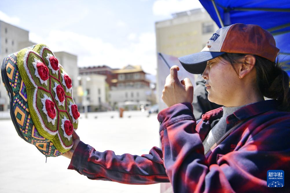 5月12日,在西藏职业技术学院职业教育活动周启动仪式暨比如县非物质文化遗产进校园活动上,一名消费者在挑选比如县的特色旅游产品。