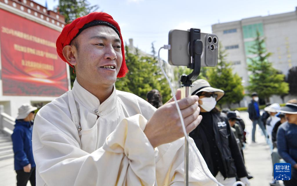 5月12日,在西藏职业技术学院职业教育活动周启动仪式暨比如县非物质文化遗产进校园活动上,来自比如县的一名旅游推介者在做现场直播。