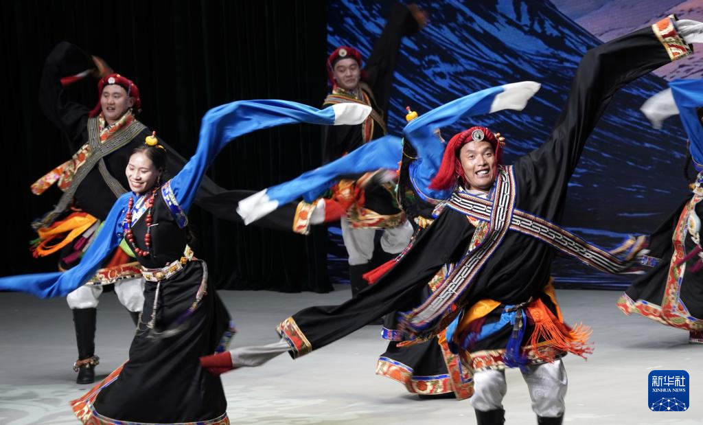 来自青海玉树藏族自治州的农牧民演员在表演《高原踏舞》(5月13日摄)。