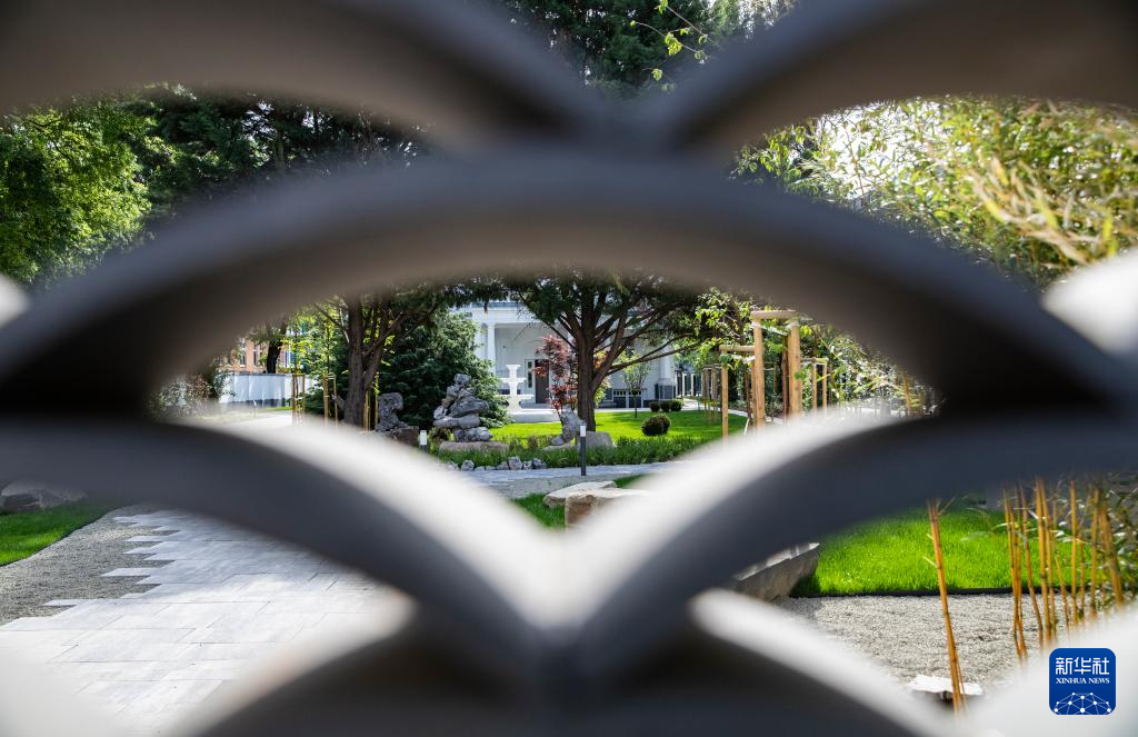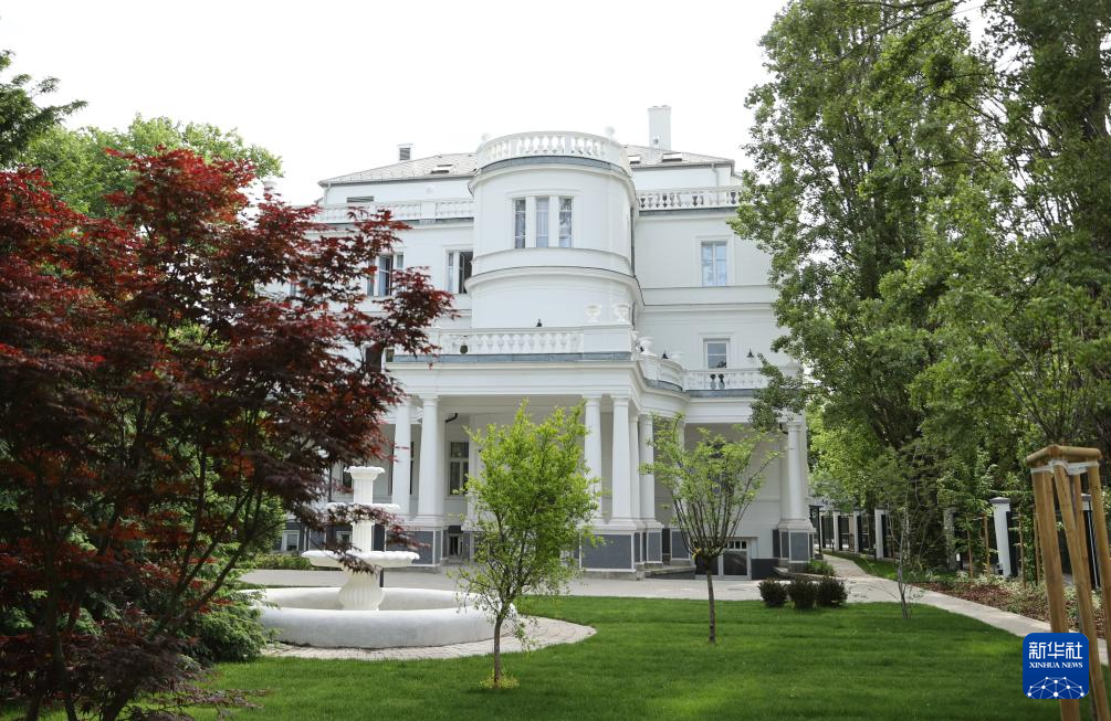5月6日,人们走在匈牙利布达佩斯中国文化中心的花园内。