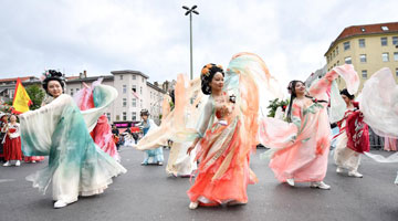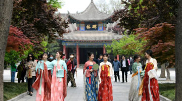 5月19日,游客在西安长安十二时辰景区观看表演《霓裳羽衣舞》。